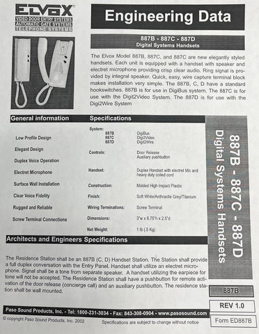 The 887B new elegantly styled handset. Each unit is equipped with a handset with speaker and electret microphone providing crisp clear audio. Ring signal is provided by integral speaker. Quick, easy, wire capture terminal block makes installation very simple. The 887B is a standard hook switches. 887B is for use in DigiBus system.